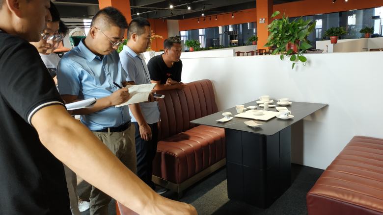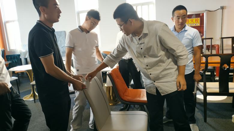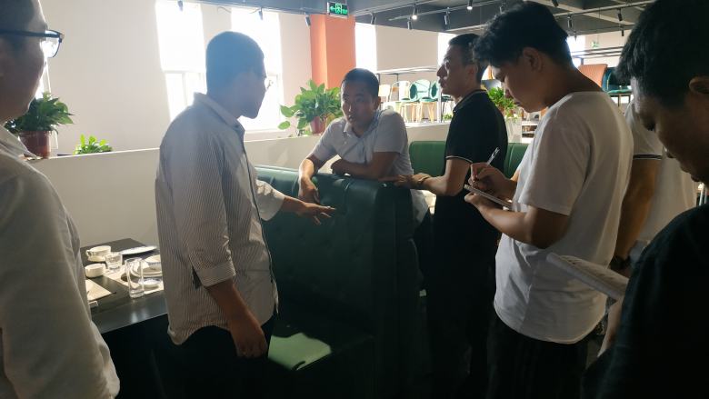 隨后,周經(jīng)理帶領(lǐng)新伙伴挨個對展廳里面的餐桌椅及電動餐桌和卡座沙發(fā)做了深入講解,現(xiàn)場不明白的問題新員工也都及時的得到了清晰地答復(fù)。在后面的互動環(huán)節(jié),周經(jīng)理還隨機(jī)點名讓新員工對展廳里面的餐桌的材質(zhì)進(jìn)行回答,還包括電動餐桌的尺寸計算,餐椅配備數(shù)量計算等基礎(chǔ)問題進(jìn)行了考核,大家的回答幾乎都是正確的。