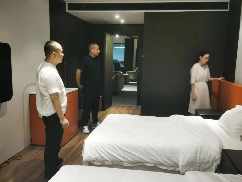 國慶假期期間,當(dāng)很多公司放假后人們都攜帶一家老小外出游玩的時(shí)候,來自商洛丹鳳縣的酒店客戶放棄休假時(shí)間專程來到西安酒店家具生產(chǎn)廠家排名前三的博菲克酒店家具工廠,在廠里等候已經(jīng)的博菲克總經(jīng)理?xiàng)钚怯H自熱情的接待。 這次過來之前,客戶順路先去了一趟我們博菲克九月份簽約的商洛某高端民宿工地現(xiàn)場(chǎng),這里有我們已經(jīng)做好的酒店家具正在交貨安裝。對(duì)于酒店客戶而言,選擇酒店家具廠家無可厚非的三個(gè)重點(diǎn)就是品質(zhì)、價(jià)格和服務(wù)。當(dāng)他們?cè)谏搪迕袼揄?xiàng)目仔細(xì)端詳著每一件家具工藝的時(shí)候,熱情的甲方也迎上前來主動(dòng)扮演起了“推銷員”。“我們這個(gè)民